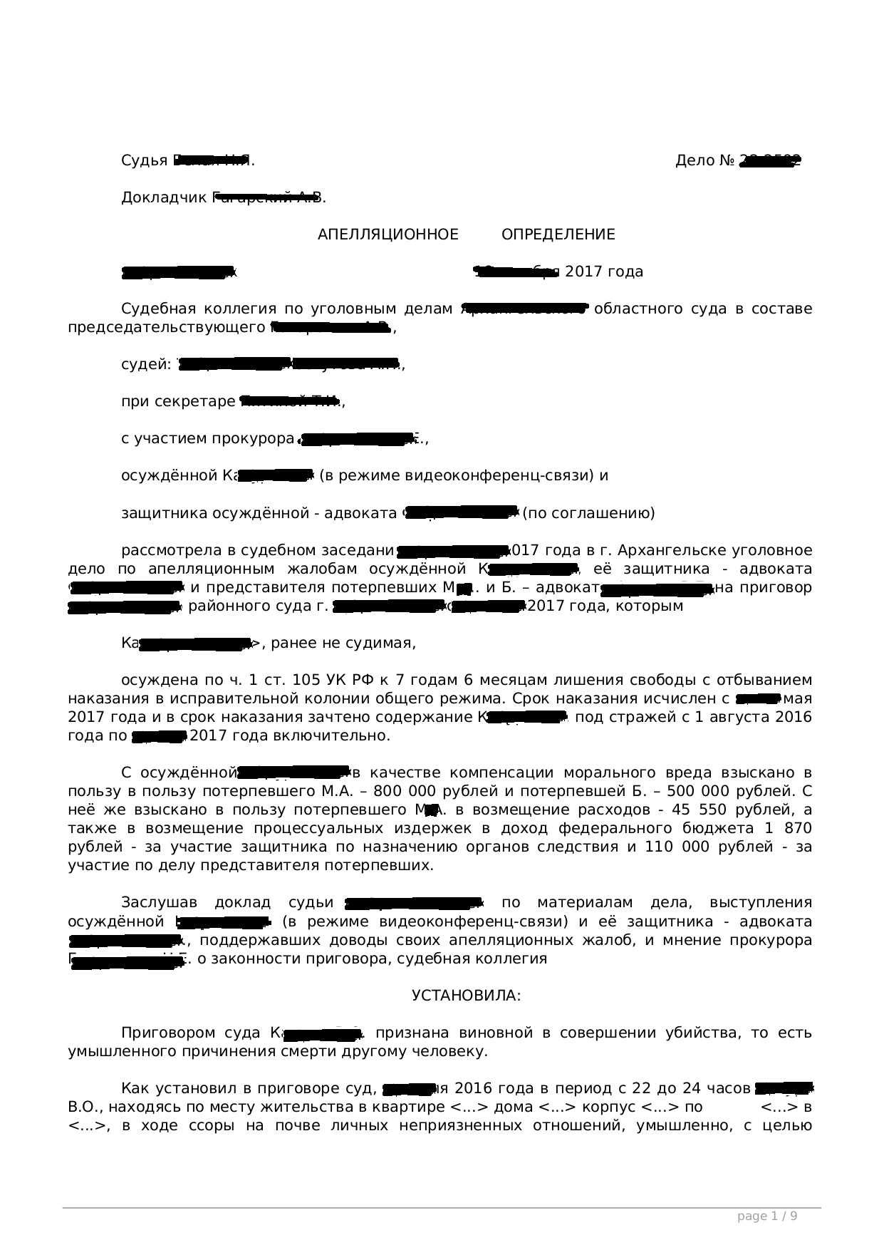 Гражданка N обвинялась по ч. 1 ст. 105 УК РФ. Суть: обвиняемая нанесла потерпевший 7 ножевых ран, от которых она скончалась на месте. Суд установил, что гражданка N проживала с мужем и двумя детьми. Муж жене изменял, о чём супруга знала, но пыталась «сохранить брак». Любовница мужа оскорбляла обвиняемую, угрожала ей, что доказано адвокатом обвиняемой. В день убийства гражданка N с детьми вернулась домой, где застала мужа и потерпевшую в кровати. Обвиняемая увела детей в другую комнату, дальше ничего не помнит. Пришла в себя в кабинете следователя, который рассказал произошедшее (убийство потерпевшей). Психиатрическая экспертиза, на которой настоял адвокат по 105, подтвердила, что гражданка N находилась в состояние аффекта. Обвиняемая признала вину. Адвокат настаивал на переквалификации правонарушения. Суд признал доводы правозащитника, переквалифицировав ст. 105 УК РФ на 107 УК. Признал гражданку N виновной, наказание – ограничение свободы на 2 года.